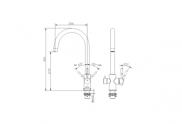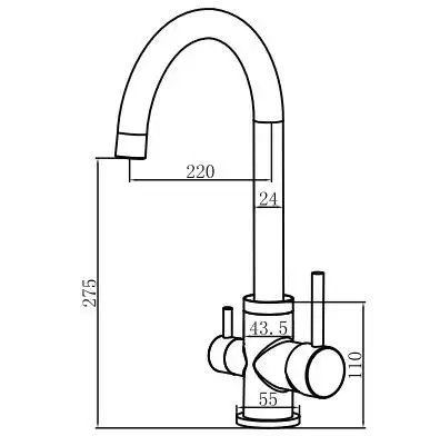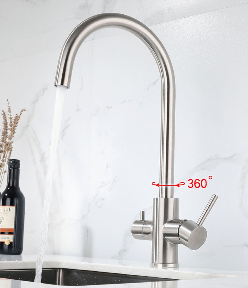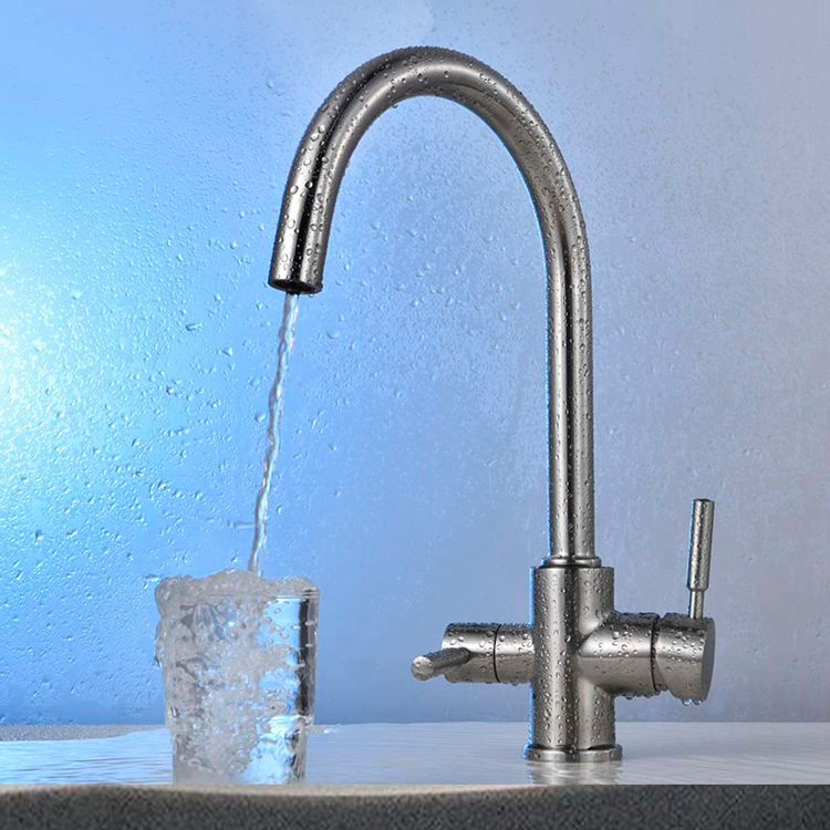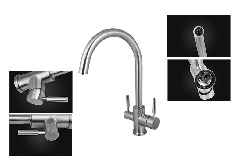 Este un model din gama premium, cu finisaj din oțel inoxidabil cu un conținut ridicat de crom, cu 2 mânere de pornire a apei, unul clasic pentru apă rece/apă caldă iar cel de al doilea mâner este pentru pornirea și oprirea apei filtrate. Capacitate mare de producție de 500 de mii de cicluri „deschidere-închidere”, este echipată cu cartuș ceramic și racorduri flexible pentru alimentare apă caldă / apă rece .